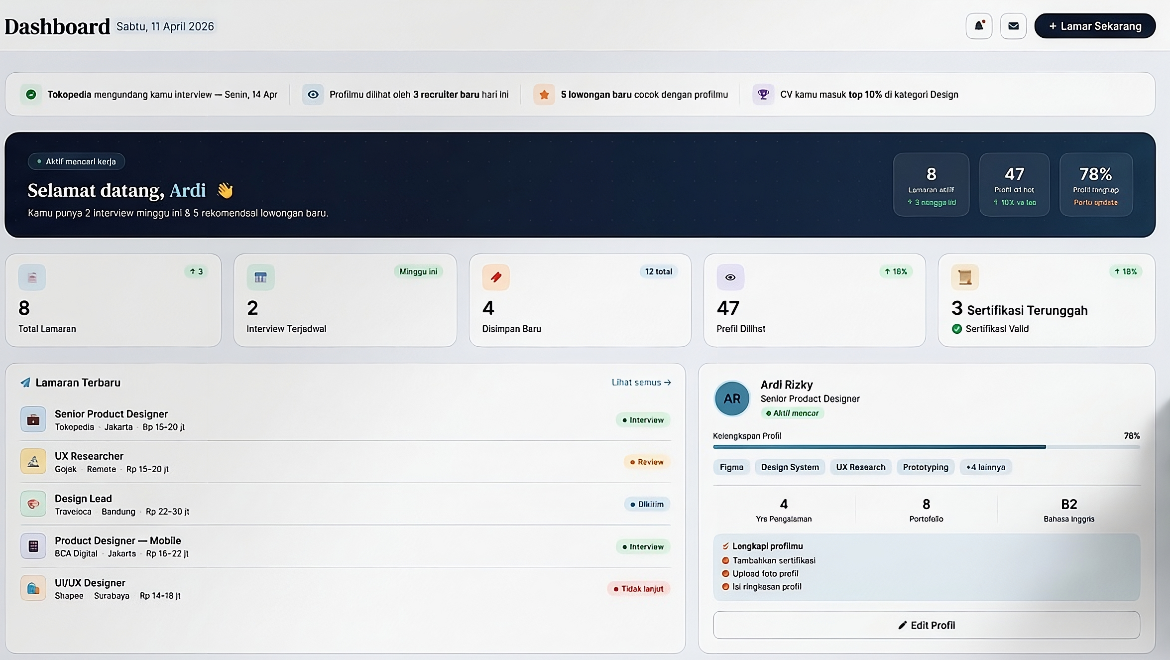 Lamar dengan satu klik dan pantau status lamaranmu secara real-time langsung dari dashboard.